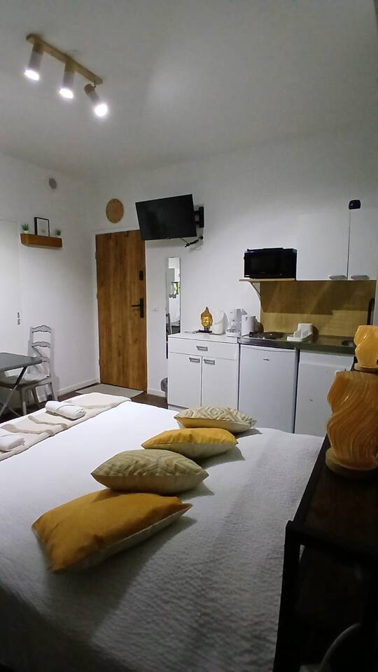 Bienvenue à Babord, un studio raffiné niché au rez de chaussé porte gauche d’une maison de 1800 entièrement rénovée. Pensé pour une escapade à deux, ce logement offre un mélange subtil de charme historique et de confort moderne, idéal pour un séjour reposant, romantique ou même télétravailler dans un cadre paisible. Configuration : 2 lit individuel confortable 1 salle de bain moderne Cuisine équipée : plaques, frigo, four, ustensiles… Le studio est entièrement équipé : Wi-Fi, rangements, linge de lit et serviettes fournis. Babord est l’endroit idéal pour un séjour élégant, intimiste et confortable, au cœur d’un bâtiment chargé d’histoire.